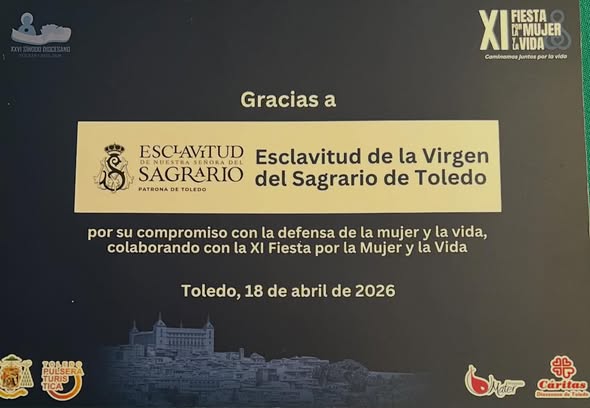 Gracias a Caritas Diocesana de Toledo por su agradecimiento a la Esclavitud por nuestro apoyo a Proyecto Mater colaborando un año más en la Fiesta por la Mujer y la Vida . Siempre estaremos estaremos a su lado en defensa de la Mujer y la Vida